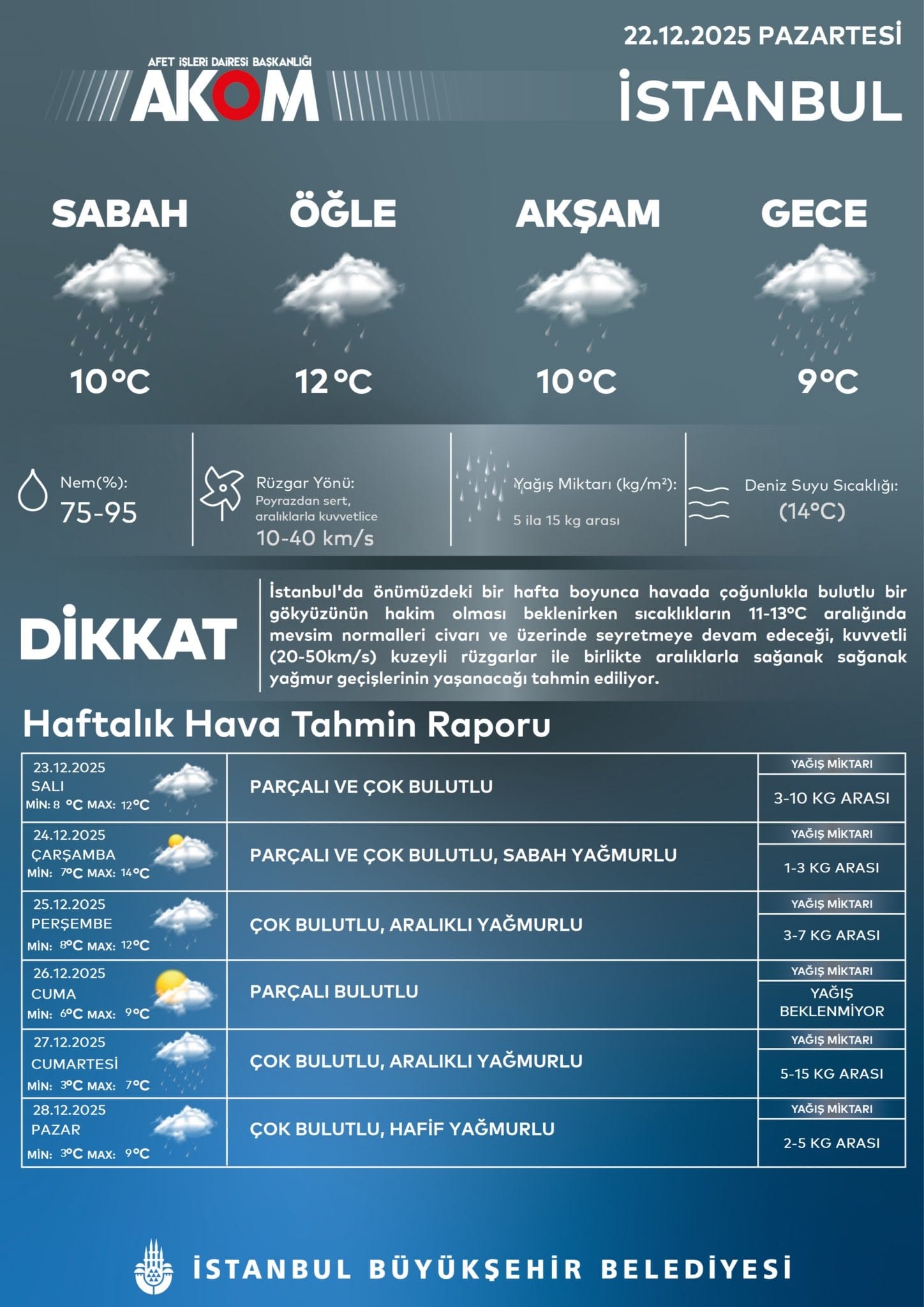 “İstanbul’da önümüzdeki bir hafta boyunca havada çoğunlukla bulutlu bir gökyüzünün hakim olması beklenirken, sıcaklıkların 11-13°C aralığında mevsim normalleri civarı ve üzerinde seyretmeye devam edeceği, kuvvetli (20-50km/s) kuzeyli rüzgarlar ile birlikte aralıklarla sağanak yağmur geçişlerinin yaşanacağı tahmin ediliyor.”