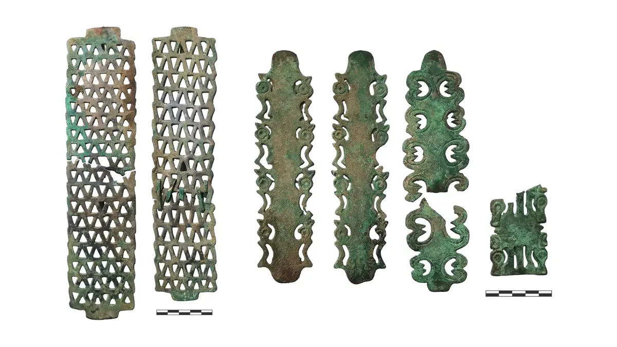 Ancak keşfin en dikkat çekici kısmı, bir tümülüsün batısındaki sığ yuvarlak bir çukurda saklanmış “zengin bir kurban kompleksi”ydi. Bu kompleks, en az bir düzine ata ait bronz alınlıklar, yanak parçaları ve demir gemler de dahil olmak üzere yüzlerce eseri barındırıyordu. Bu koşum takımlarında kuşlar, mitolojik yaratıklar, geometrik motifler ve insan yüzleri betimlenmiş metal süslemeler bulunuyordu.