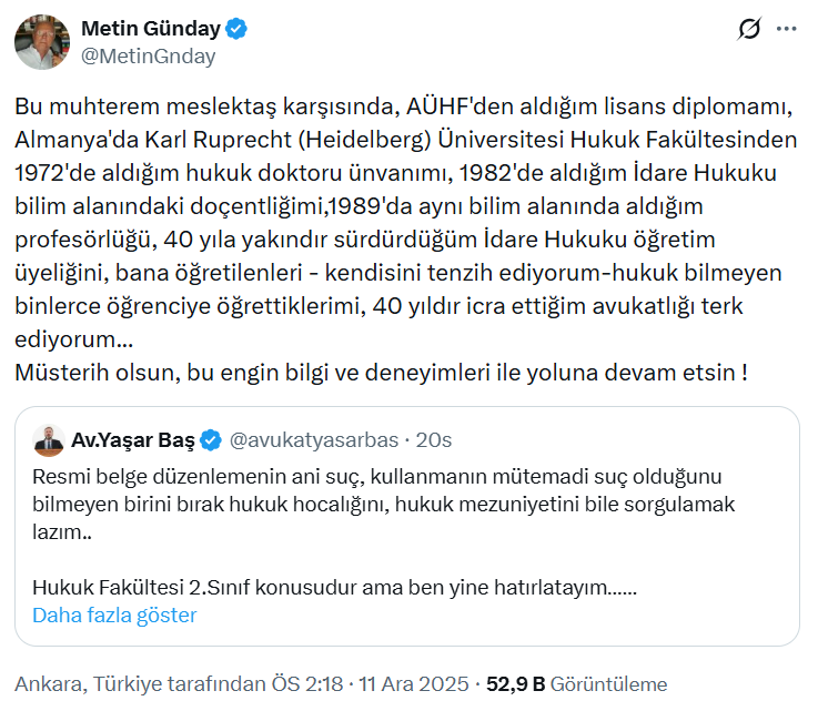 Günday’ın bu sözlerine X hesabından yanıt veren AKP’li avukat ve Hukukçular Birliği Vakfı Genel Başkanı Yaşar Baş, Günday’ın açıklamalarına yanıt verdi.