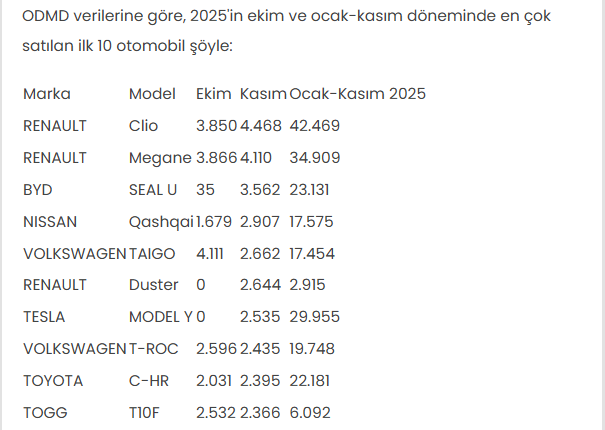 Model bazında kasım ayındaki satışlarda Clio 4 bin 468 ile Türkiye’de en çok satılan otomobil oldu. İkinci sırada 4 bin 110 ile Renault Megane Sedan bulunurken, 3 bin 562 ile BYD Seal U listede üçüncü sırada yer aldı.