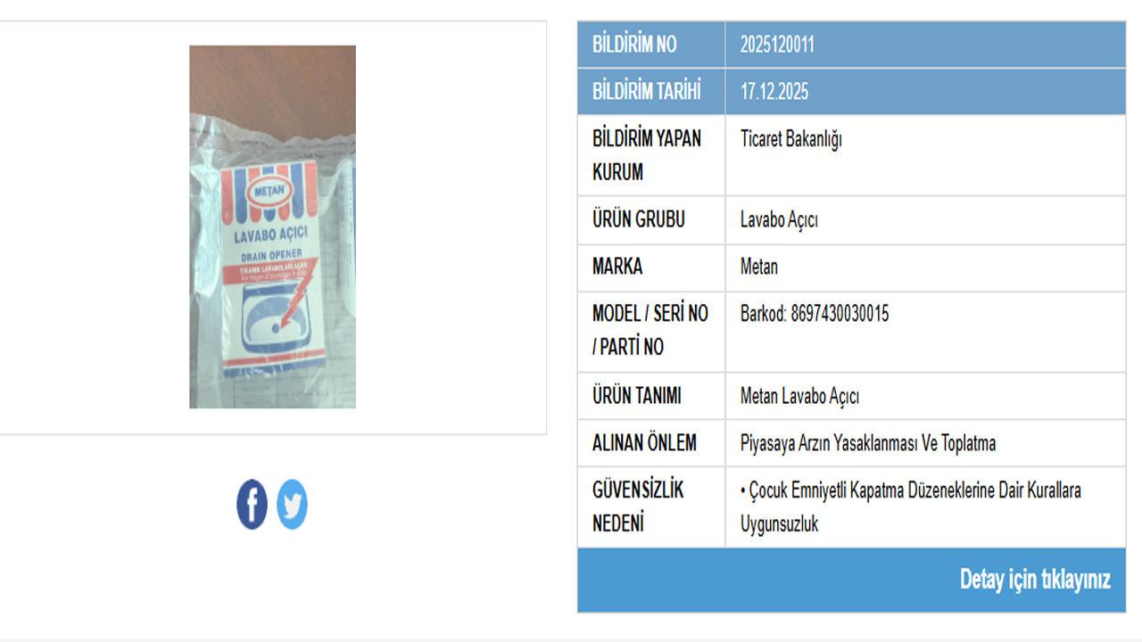 Yapılan denetimler sonucunda, Metan markasına ait bir lavabo açıcı ürünün kullanımının insan sağlığı için risk barındırdığı belirlendi. Bakanlık tarafından yapılan açıklamada, ürünün çocuk emniyetli kapatma sistemlerine ilişkin mevzuata uygun olmadığı ifade edildi.